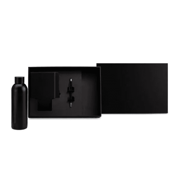 Composto por garrafa preta com dupla parede de Inox; caderno para anotações preto com capa dura e caneta esferográfica em alumínio preta.