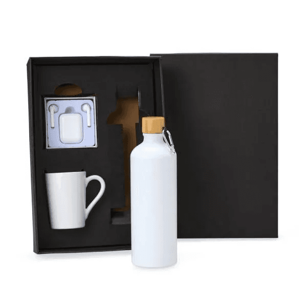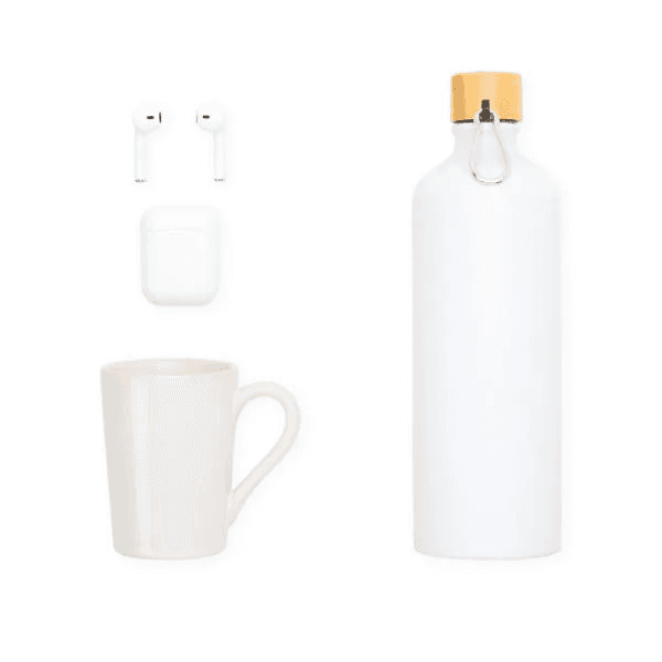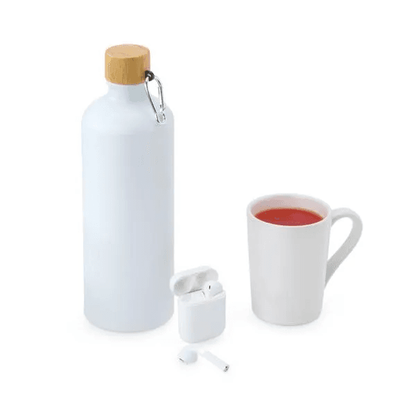 Composto por garrafa em alumínio na cor branca com capacidade de 1 litro; caneca em cerâmica branca com capacidade de 230 ml e fone de ouvido Bluetooth.