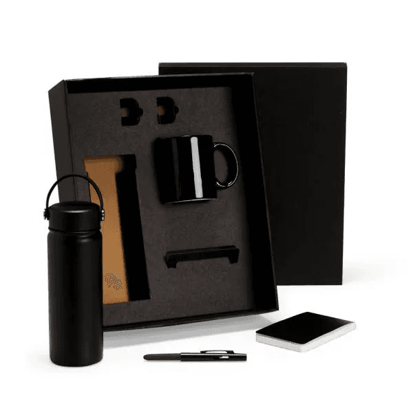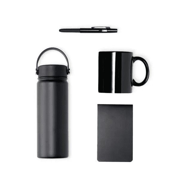 Composto por garrafa em Inox na cor preta, confeccionada com dupla camada; caneca em cerâmica preta; bloco para anotações preto e caneta esferográfica em ABS preta.