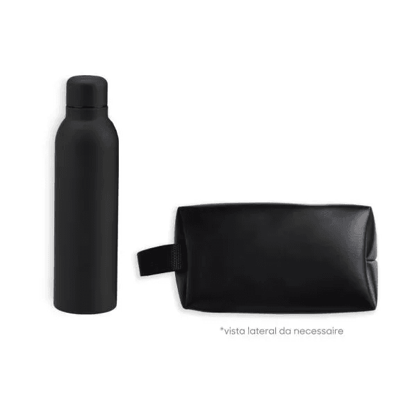 Composto por garrafa preta, confeccionada com dupla parede em Inox e necessaire com alça em material sintético na cor preta.