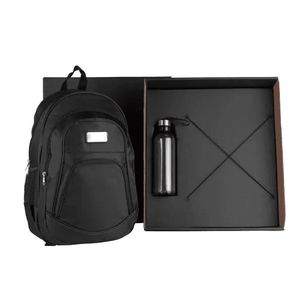 Kit composto por mochila preta em Poliester 600D/1680D que contém alças para as costas, alça para as mãos, compartimento para notebook de até 15", 3 bolsos externos com zíper e 2 bolsos externos em tela. Conta também com garrafa preta em PET.
