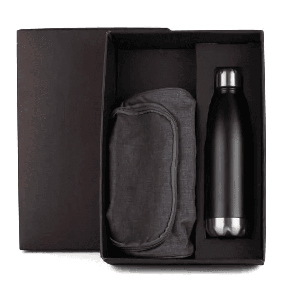 Kit necessaire e garrafa. Conta com garrafa em aço inox preta com tampa rosqueável e necessaire em poliester 300D melange cinza com gancho.