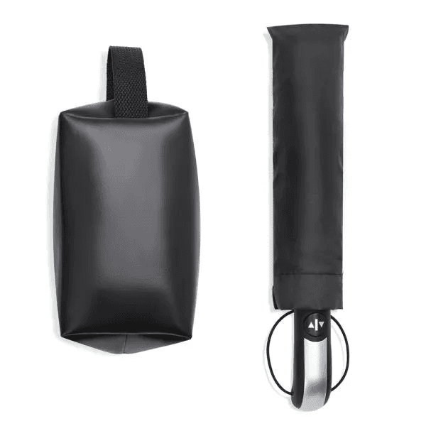 Kit necessaire e guarda-chuva. Composto por guarda-chuva confeccionado em Nylon 190T na cor preta com ativação automática ao pressionar um botão, tanto para abrir quanto para fechar, empunhadura confortável com elástico para fixar no pulso, diminuindo o risco de queda e aumentando a segurança; necessaire com alça em material sintético na cor preta.