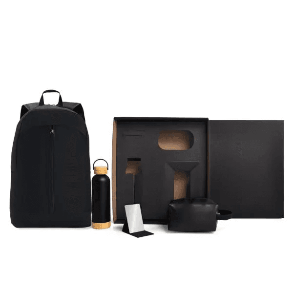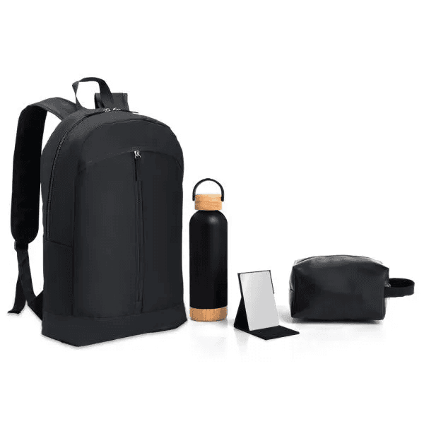 Kit feminino. Composto por mochila preta confeccionada em Polyester 600D; necessaire com alça em material sintético na cor preta; garrafa com parede dupla em Inox na cor preta em metal e espelho portátil com acabamento aveludado preto.