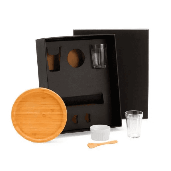 Kit para Bar e Petisco. Composto por petisqueira redonda e colher de 13 cm em Bambu; dois copos americanos em vidro e ramekin em porcelana.