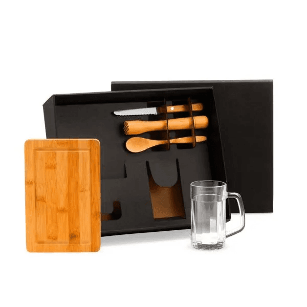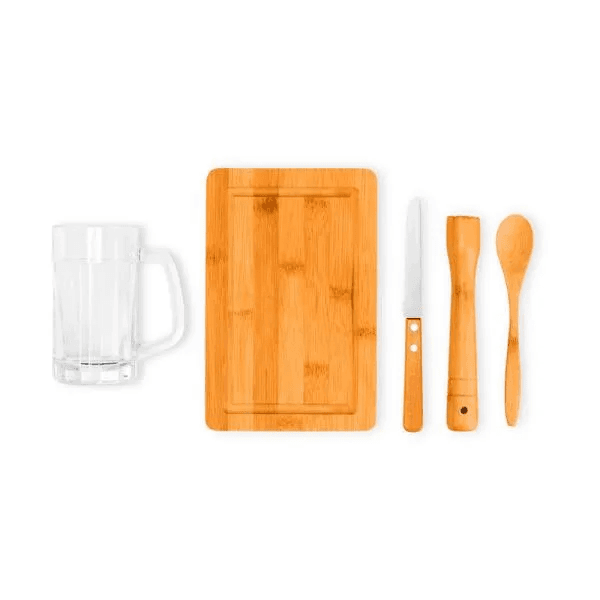 Composto por tábua retangular, amassador para caipirinha e colher de 18 cm em Bambu; faca 4" para frutas em Madeira/Inox e caneca para cerveja/chopp em vidro.