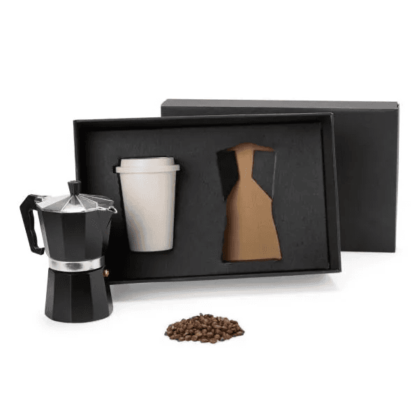Kit para café. Composto por cafeteira modelo Italiana em alumínio de alta qualidade e resistência e copo em Fibra de Bambu / PP.