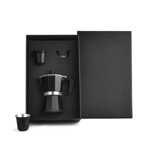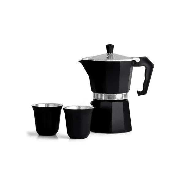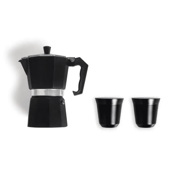 Kit para café. Composto por cafeteira modelo Italiana em alumínio de alta qualidade/resistência e dois copos para café em aço inox.
