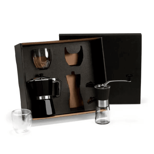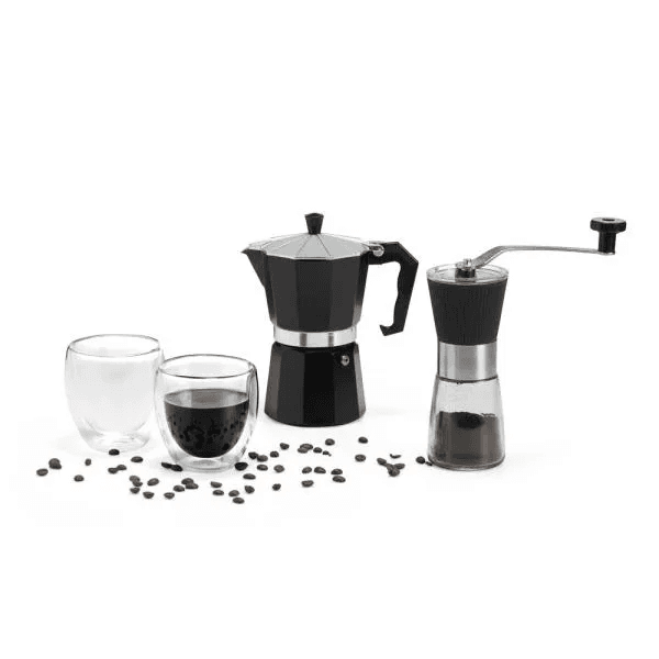 Composto por cafeteira modelo Italiana em alumínio; moedor manual para café confeccionado em Vidro/Inox; dois copos em vidro com parede dupla de 250 ml cada.