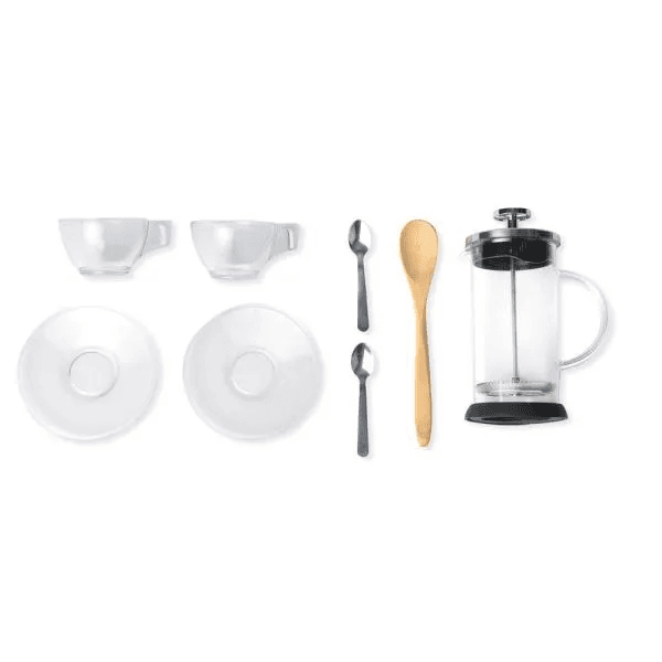 Cafeteira prensa francesa em vidro, duas xícaras com pires em vidro, duas colheres em inox e uma colher em bambu de 18 cm.