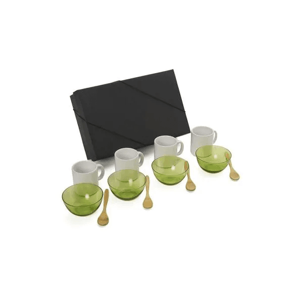 Kit matinal. Conta com quatro canecas em cerâmica; quatro tigelas em vidro e quatro colheres em bambu.