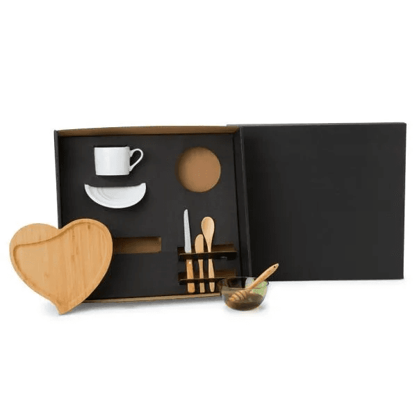 Composto por petisqueira em formato de coração, espátula de 14cm, meleira e colher de 18cm em Bambu; faca em Madeira/Inox; tigela em Vidro; xícara e pires em Porcelana. Estão perfeitamente acomodados em uma caixa para presentear.