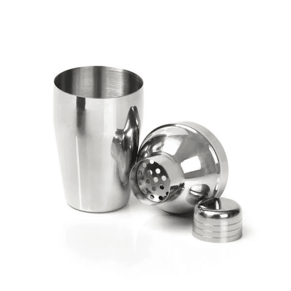 Kit composto por seis acessórios para caipirinha, sendo uma coqueteleira em Aço/Inox escovado de 350ml; faca 4" para frutas em Madeira/Inox; socador/pilão, colher de 18cm e uma tábua pequena em Bambu com cabo e orifício em Bambu. Possui ainda uma base em Bambu com vão e suporte para o copo.