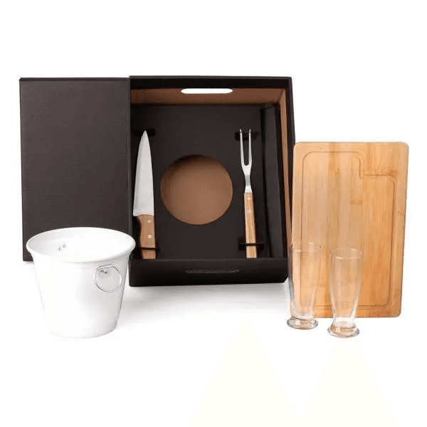 Kit para churrasco. Conta com tábua em bambu; Faca 7" e garfo em inox/madeira; 2 copos em vidro e balde para gelo 4L em alumínio branco.