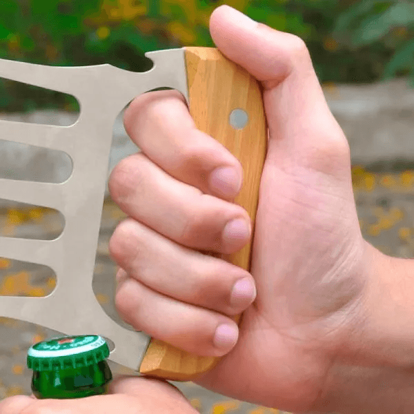 Kit para Churrasco. Composto por tábua em Bambu; garfo trinchante, faca 8" e garfo de 5 dentes com abridor de garrafa em Madeira/Inox. Tábua confeccionada com tripla camada invertida, para dar maior durabilidade e não deformar com o passar do tempo. Rebites em Aço Inox 304, um dos mais resistentes à ferrugem e corrosão.