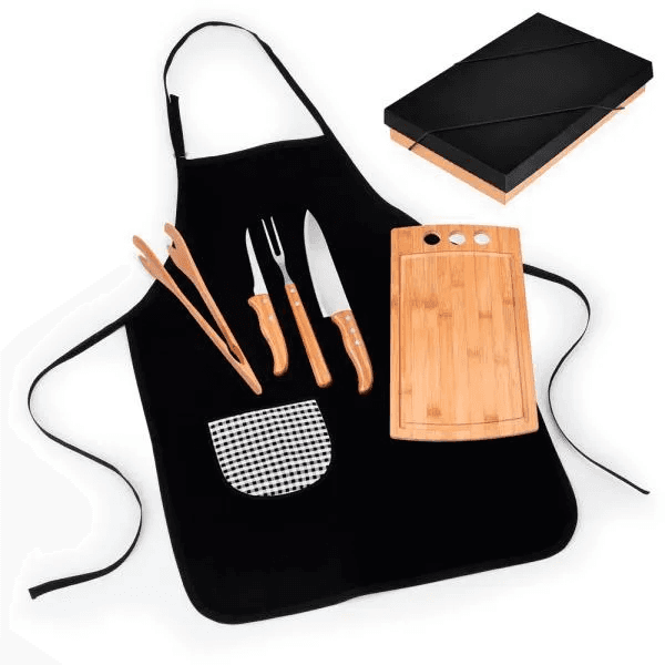 Kit Para Churrasco Em Bambu / Madeira / Inox Com Avental - 6 Pçs ME-21803