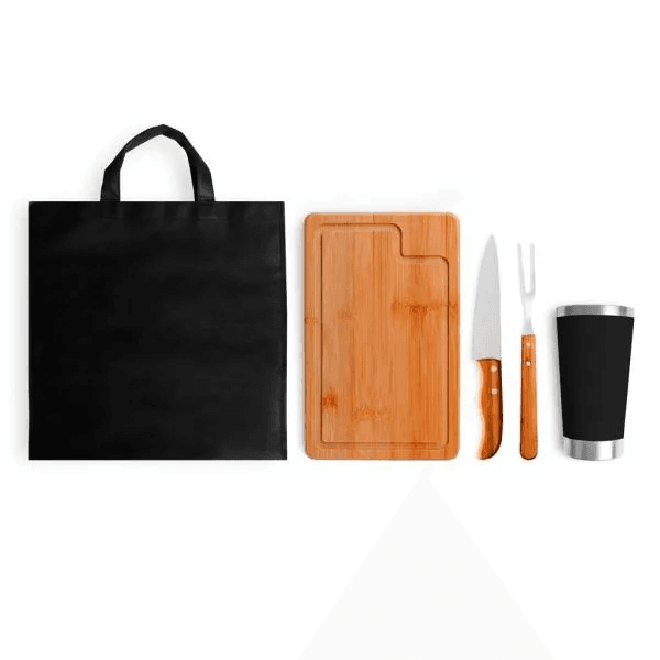 Kit para churrasco/cerveja com sacola. Conta com tábua em bambu; faca 7" e garfo em aço madeira/inox; sacola preta em TNT com alças; copo térmico com tampa e abridor de garrafas.