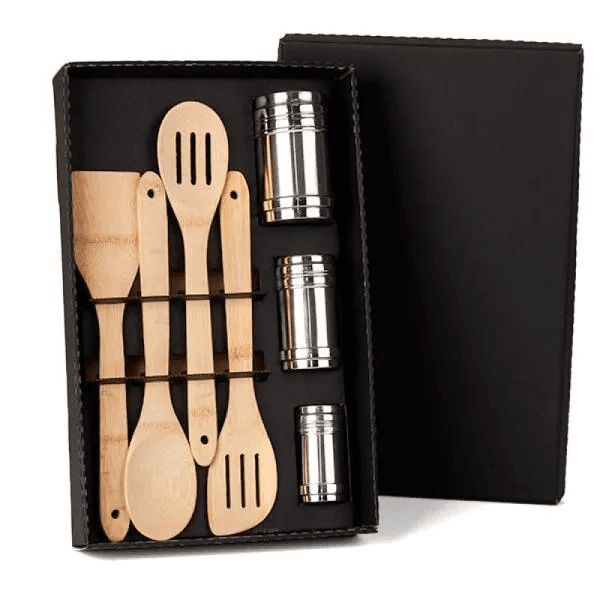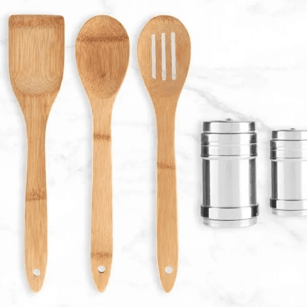 Kit para cozinha e tempero; Conta com colher, colher perfurada, espátula quadrada e espátula perfurada em bambu e 3 potes para tempero em inox.