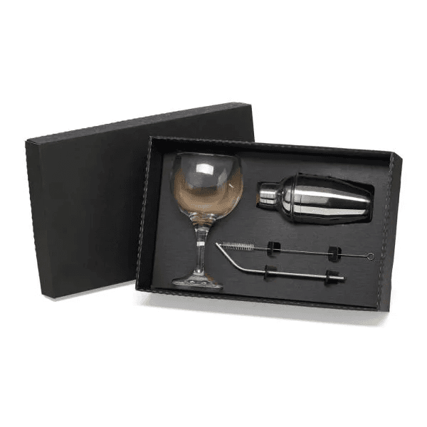 Conta com coqueteleira, canudo e limpador em inox; Taça em vidro