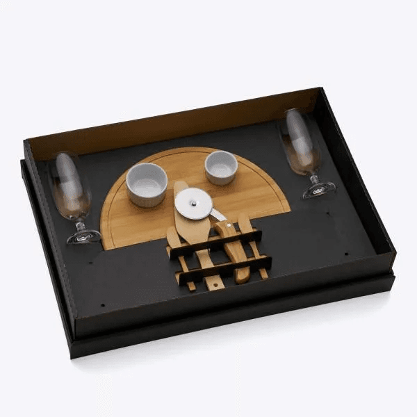Composto por tábua para Pizza, espátula para Pizza e duas espátulas de 14 cm em Bambu; cortador de pizza em Madeira/Inox; duas taças para cerveja em vidro e dois ramekins em porcelana.