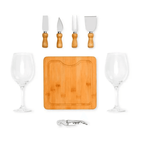 Composto por tábua em Bambu quadrada para Queijo/Petisco; duas facas, sendo, uma com ponta e outra reta, garfo e espátula em Madeira/Inox; duas taças em vidro para Vinho e abridor saca-rolhas em aço Inox escovado.