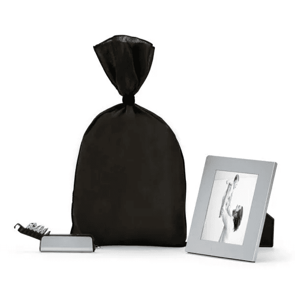 Composto por porta-retrato em alumínio fosco com vidro frontal, apoio em polipropileno preto e uma fina espuma no interior para acomodar melhor a foto. Conta também com conjunto de ferramenta em Polipropileno preto/prata.
