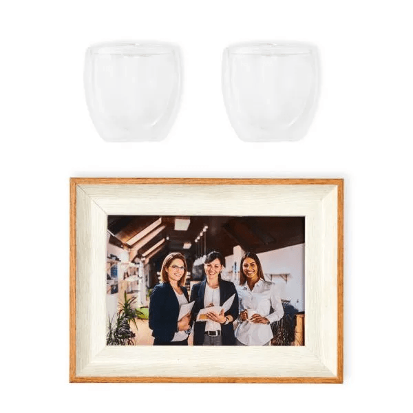 Composto por porta-retrato em Madeira e dois copos em vidro com parede dupla 100 ml cada.