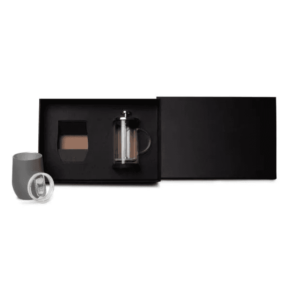Kit cafeteira prensa francesa e copo térmico. Composto por cafeteira prensa francesa em vidro com capacidade de 350 ml. Conta também com copo térmico cinza com tampa, contendo a capacidade de 340ml e é confeccionado com dupla parede de inox, isolada a vácuo.