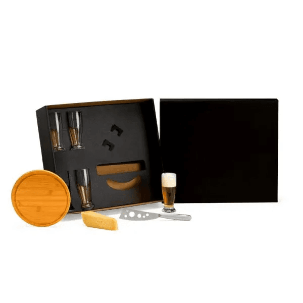 Kit para queijo e cerveja; Conta com tábua redonda para queijo/petiscos; Faca para frios em metal; Quatro copos para cerveja em vidro. Estão perfeitamente acomodados em uma caixa para presentear.