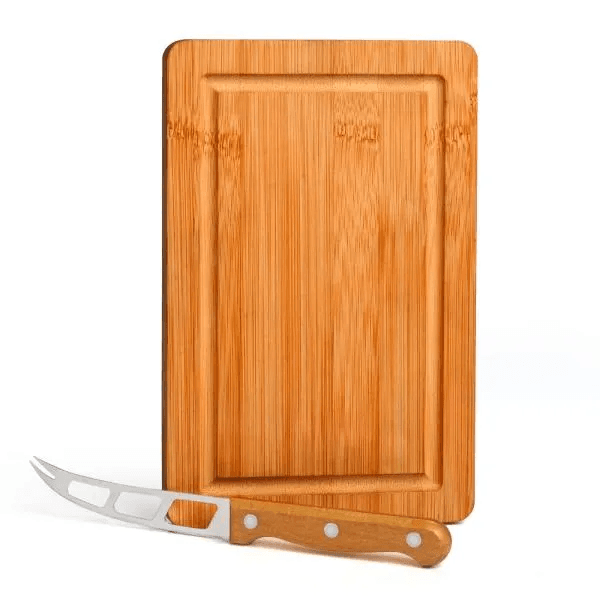 Kit Queijo e Vinho. Composto por tábua retangular para queijo em Bambu; faca 4" para queijo com cabo em Madeira/Inox e duas taças para Vinho em vidro.