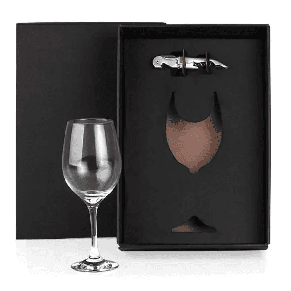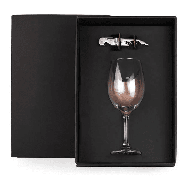 Kit vinho com abridor. Composto por uma taça de vidro para vinho com capacidade de 490ml e abridor saca-rolhas em aço inox escovado.