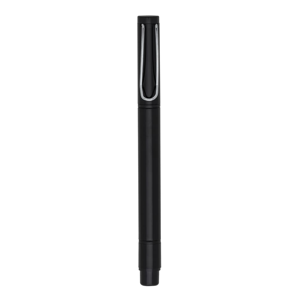 Caneta plástica com marca texto amarelo e carga esferográfica azul 1.0 mm, ambas com tampas protetoras.