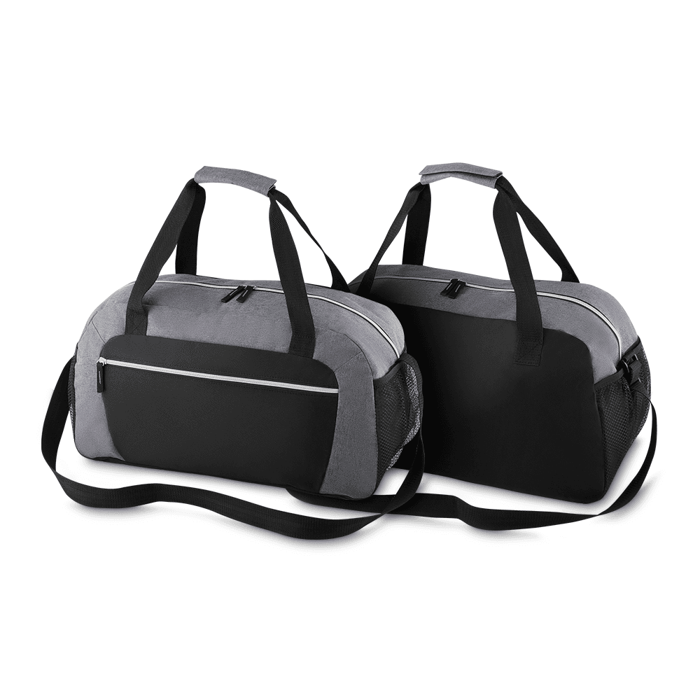 Mala esportiva em poliéster 600D e 300D, zíper frontal, bolsos laterais, alça de mão e ombro.