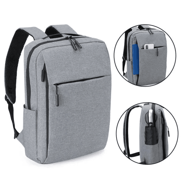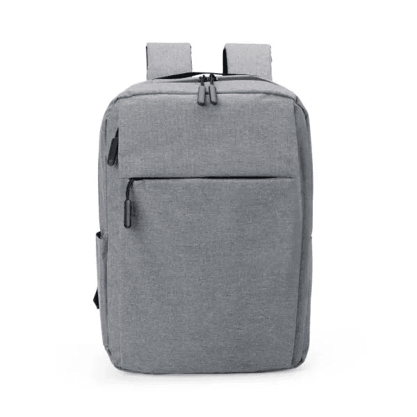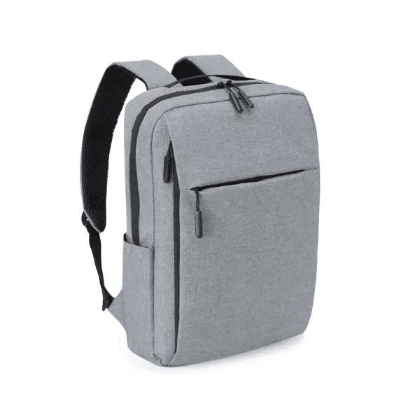 Mochila cinza em poliéster 300D. Conta com compartimento principal com espaço para notebook e fecho em velcro para melhor fixação e segurança do notebook, compartimento médio com zíper vertical e um compartimento menor com zíper horizontal; além dos compartimentos com zíper, contém também um bolso externo lateral. Conta também com alças almofadadas e ajustáveis para as costas e alça de mão.