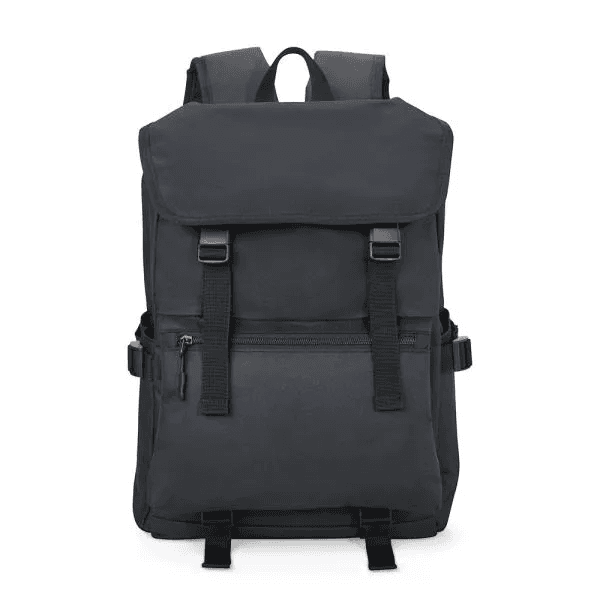 Mochila preta confeccionada em Polyester 600D. Conta com bolso principal com fechamento com cordão e aba com fecho de engate rápido, bolso frontal com ajuste, 2 bolsos laterais com ajuste para controlar o volume da mochila, alças ajustáveis, alça de mão e alça carona para mala. Espaço interno com divisória para notebook com acabamento acolchado.