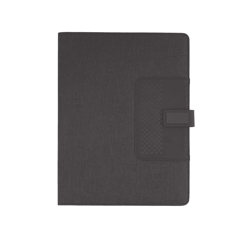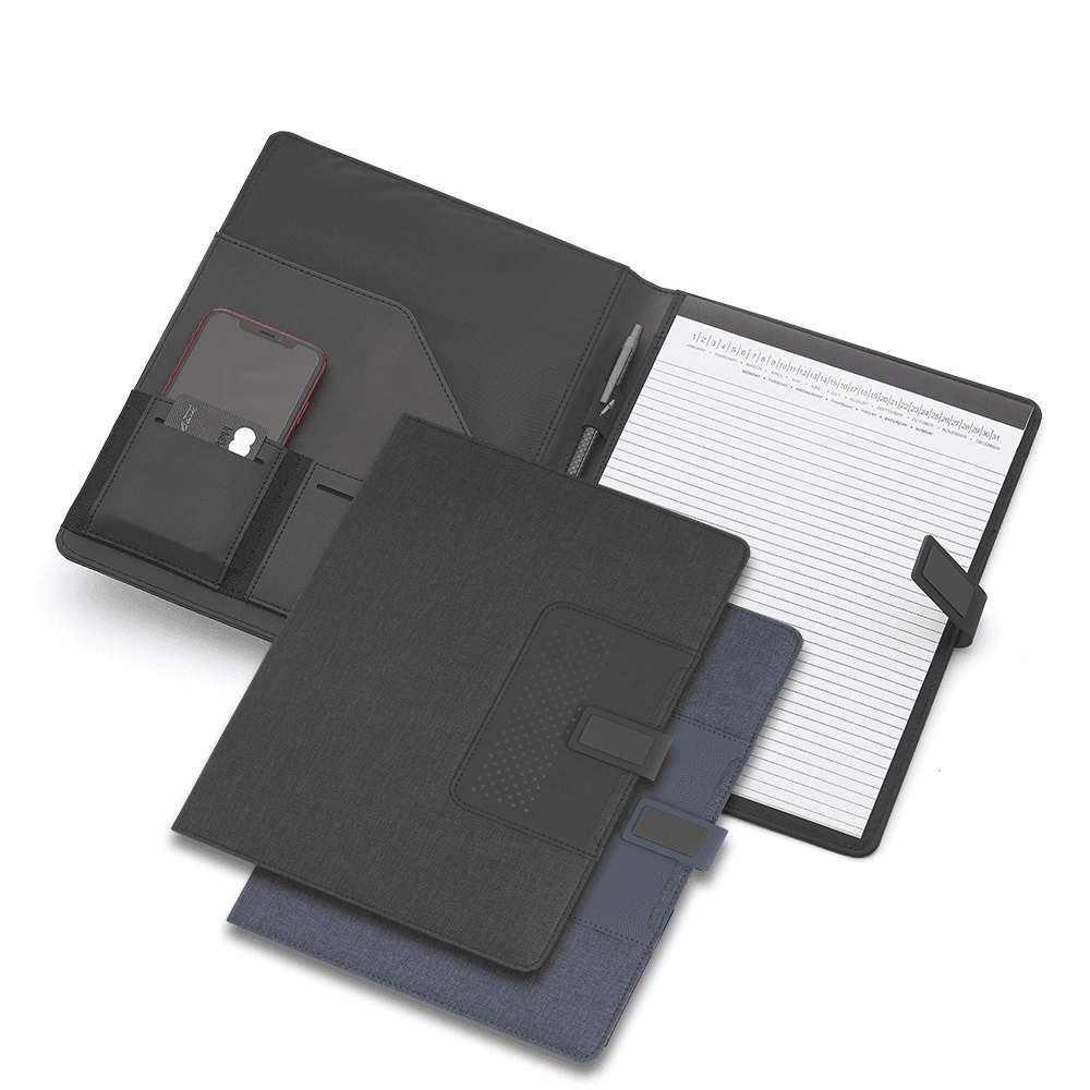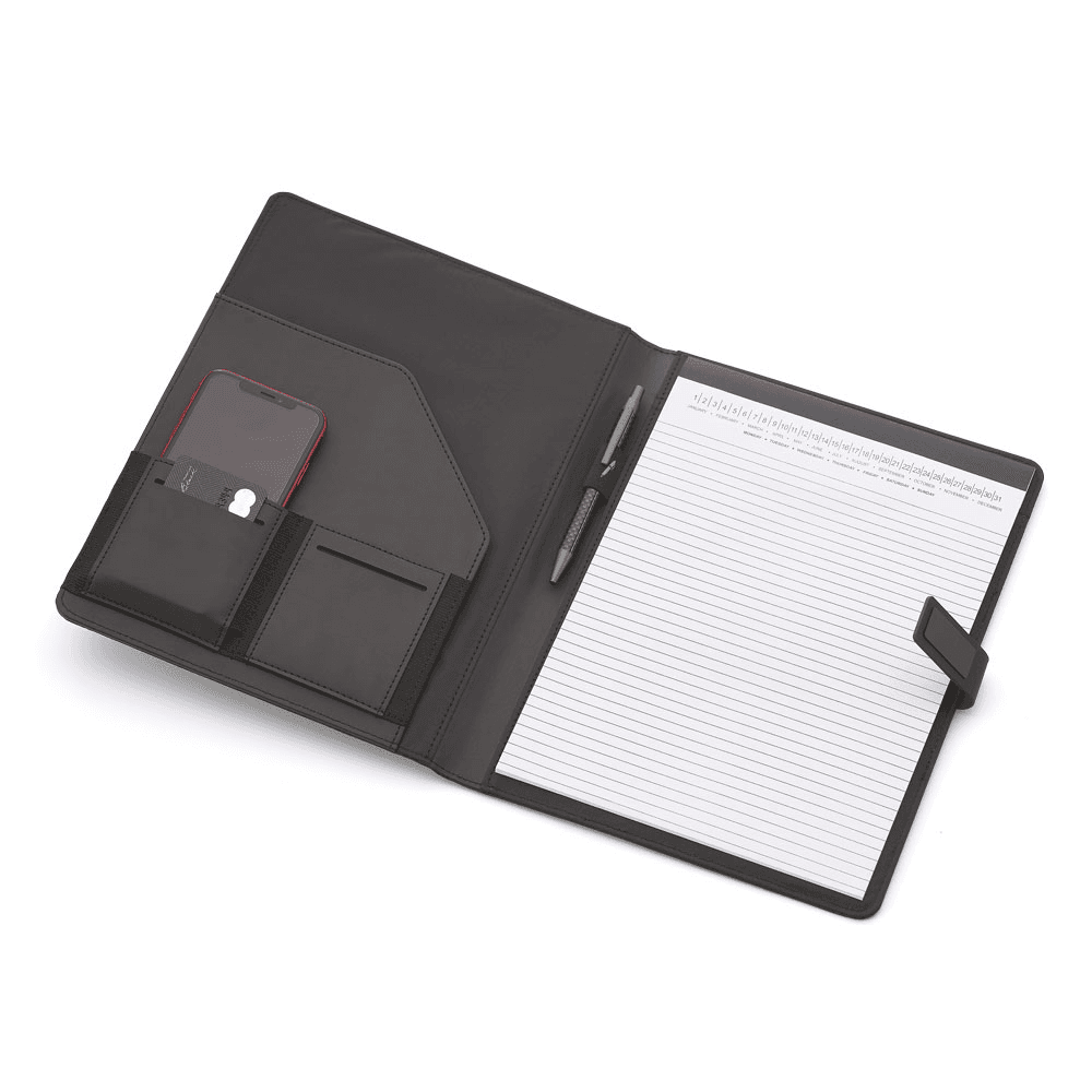 Pasta Executiva Almofadada com caderno de 20 folhas A4, Bolso na capa 8x12cm, Bolso interno para Cartões, Telefone e Documentos, Fechadura Magnética.