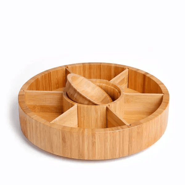 Petisqueira giratória em bambu. Conta com seis divisórias, com placas removíveis, e um bowl para molhos e patês.