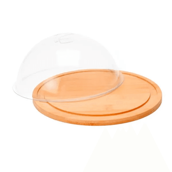 Porta queijo em Bambu/Policarbonato. Conta com base em bambu Ø22cm e tampa em Policarbonato.