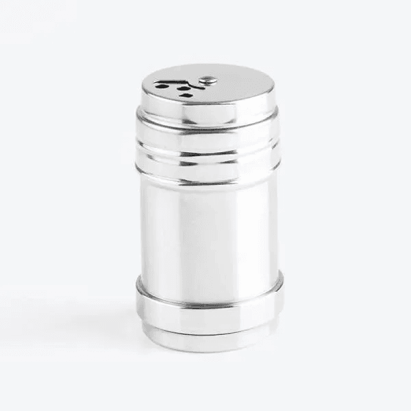 Pote de aço inox para tempero com tampa giratória e tamanho de 8cm x 4cm.