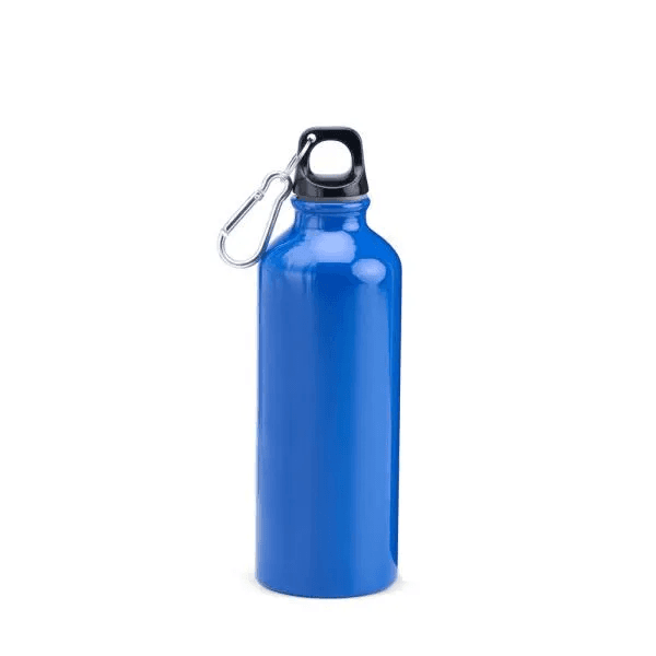 Squeeze azul em alumínio revestido com verniz. Possui tampa em polipropileno rosqueável, argola com mosquetão e anel em silicone para vedação.