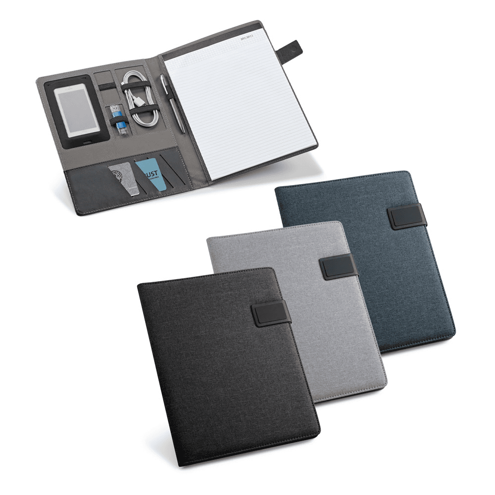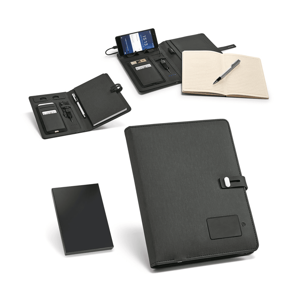52075 AFONSO. Pasta A5 em c. sintético com bateria portátil embutida (lítio) 4.000 mAh e caderno com 128 páginas pautadas